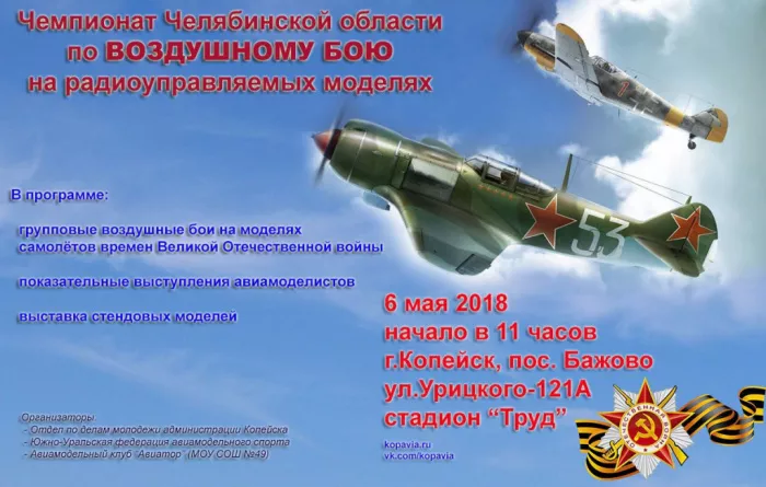6 мая 2018 года на стадионе "Труд" в поселке Бажово пройдет открытый чемпионат Челябинской области по воздушному бою на радиоуправляемых самолетах в классе «Союз-500».
