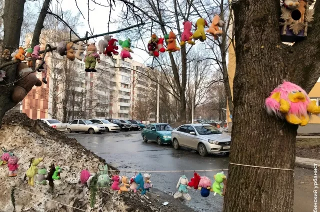 В одном из дворов Челябинска появилось «кладбище мягких игрушек». Его создали местные жители, развесив различных мишек, зайчиков и птичек на деревьях.