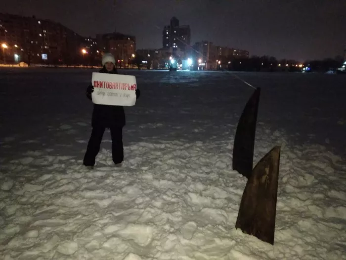 Александр рассказал, что эту акцию он придумал несколько недель назад. Черные плавники, которые он установил в лед озера рядом с "путинским пляжем", олицетворяют борьбу за свободу китов.
