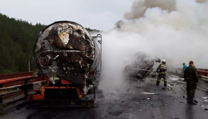 Авария произошла вчера, 16 июня, на трассе М5 в районе Юрюзани. У грузовика, который вез битум, отказали тормоза, и он влетел во встречную фуру. От удара битумовоз вспыхнул.