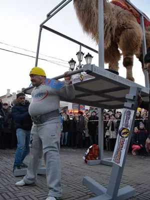 Перед тем как поднять на свои плечи большой груз, Нигматуллин провел разминку. Когда верблюда привели на площадку, зрителей убедительно попросили выключить вспышки у фотоаппаратов, чтобы не напугать Васю, которого, кстати, доставили на место на грузовике.