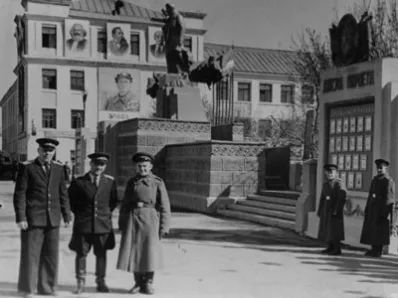 На фотографии, присланной на конкурс «Где эта улица? Где этот дом?» Павлом Ивановичем Савуковым, председателем городского совета ветеранов, как раз запечатлено время, когда архитектурной доминантой площади была каменная фигура Иосифа Виссарионовича. Монумент был воздвигнут в 1952 году, а спустя десять лет, когда развенчание культа личности Сталина достигло своего апогея, демонтирован, уступив место знакомому каждому из нас памятнику Ленину. Данный факт стал отзвуком события всесоюзного масштаба: в 1961 году тело Иосифа Сталина было вынесено из мавзолея на Красной площади.