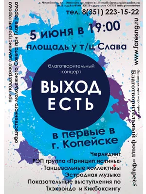 Завтра, 5 июня, на площади Трудовой Славы в Копейске пройдет благотворительная акция, направленная на привлечение молодежи к здоровому образу жизни, «Выход есть».