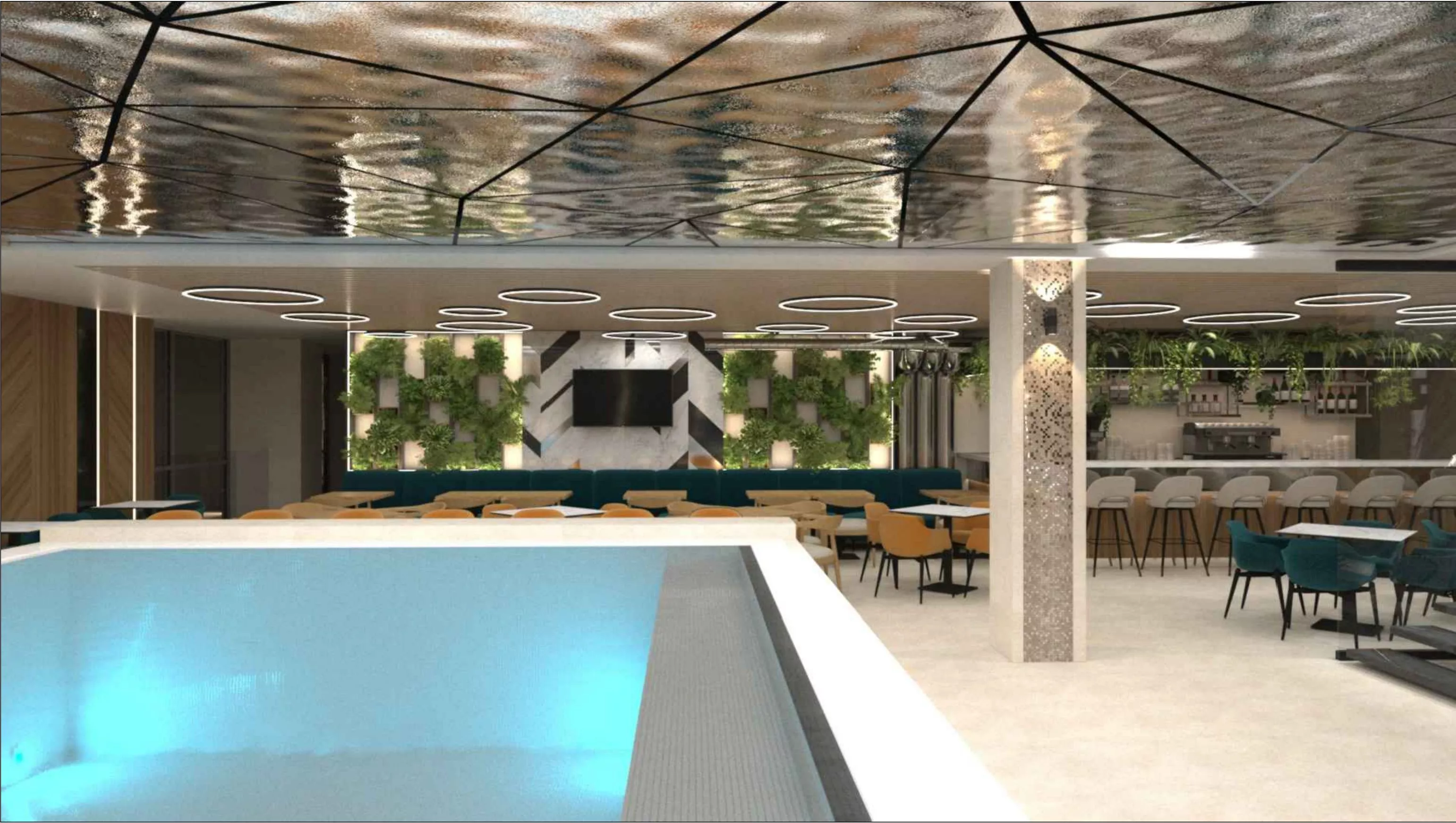 Ниже этаж лобби: гостевой вход, кассовая зона, раздевалки, душевые и магазин купальных принадлежностей.