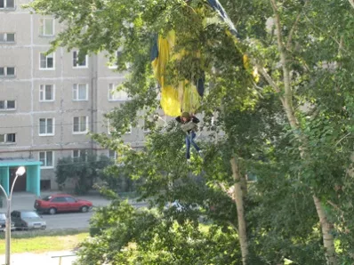 В субботу, 27 июля, в половине седьмого вечера на пульт пожарной части № 210, расположенной в поселке Октябрьский Копейского городского округа, поступил звонок из аэроклуба «РОСТО». Выяснилось, что в селе Калачево во время прыжка одну из парашютисток унесло ветром, и ей необходима помощь. К месту вызова незамедлительно был направлен дежурный караул. Через несколько минут пожарные прибыли к аэроклубу, где взяли координаты предполагаемого места ЧП. Прибыв в лес, огнеборцы увидели такую картину: на березе, метрах в 20-ти над землей, вниз головой висела парашютистка. Прямо посреди леса спасатели установили трехколенную лестницу, но ветки помешали подобраться к девушке достаточно близко, одному из пожарных пришлось еще