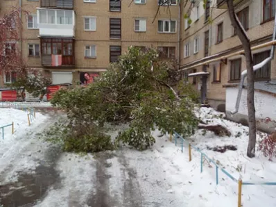 Тут и там на дорогах города можно увидеть многолетние махины, преграждающие автомобилям путь. Дело в том, что снег выпал неожиданно, и деревья еще не успели сбросить листву. Налипание на них мокрого снега привело к тому, что стволы не выдерживают такой тяжести и валятся на землю.