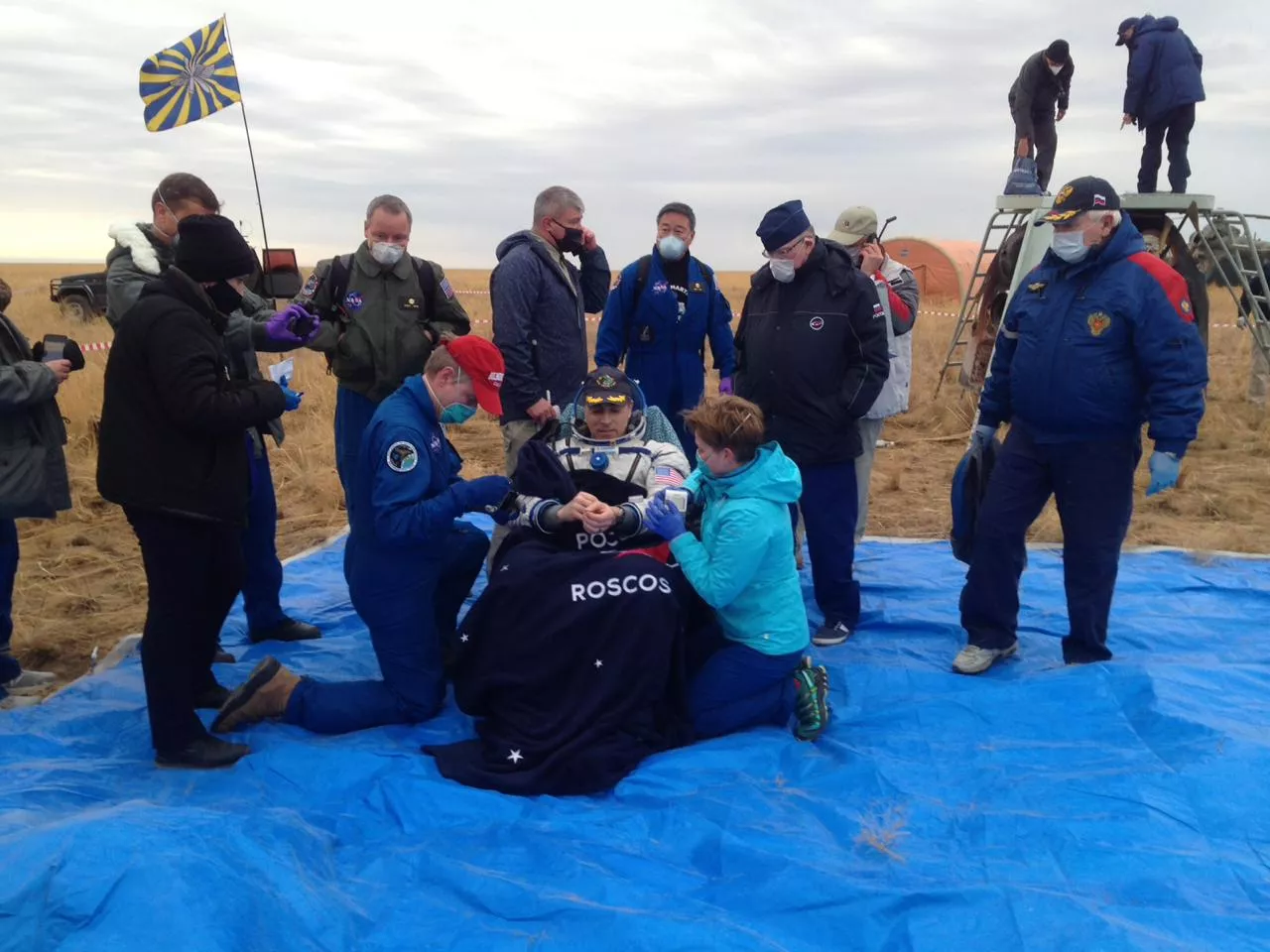Спускаемый аппарат пилотируемого космического корабля «Союз МС16» совершил посадку в казахстанской степи в районе города Жезказган. После приземления космонавтов осмотрят медики, а затем они на вертолете прилетят в ближайший город,