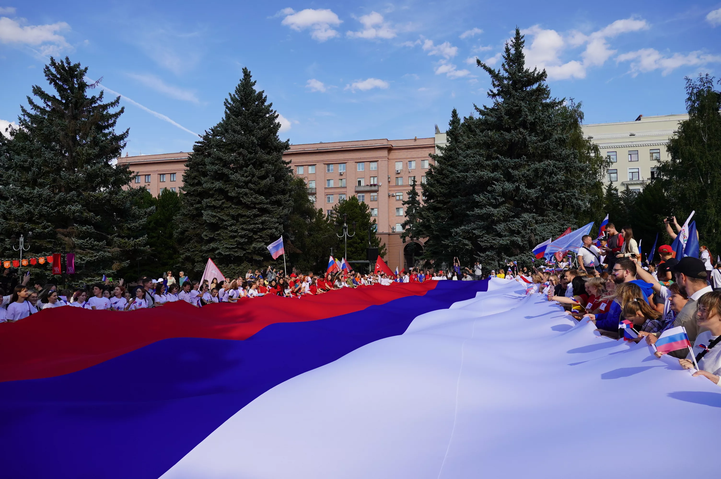 Праздничное шествие закончилось растягиванием триколора размером 10 на 30 метров. Огромный российский флаг развернули за памятником В.И. Ленину на площади Революции.