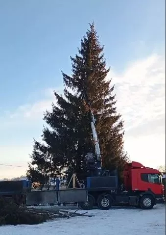Елка-красавица в данный момент готовится к транспортировке. Она станет центральной частью композиции новогоднего ледового городка на площади Славы.