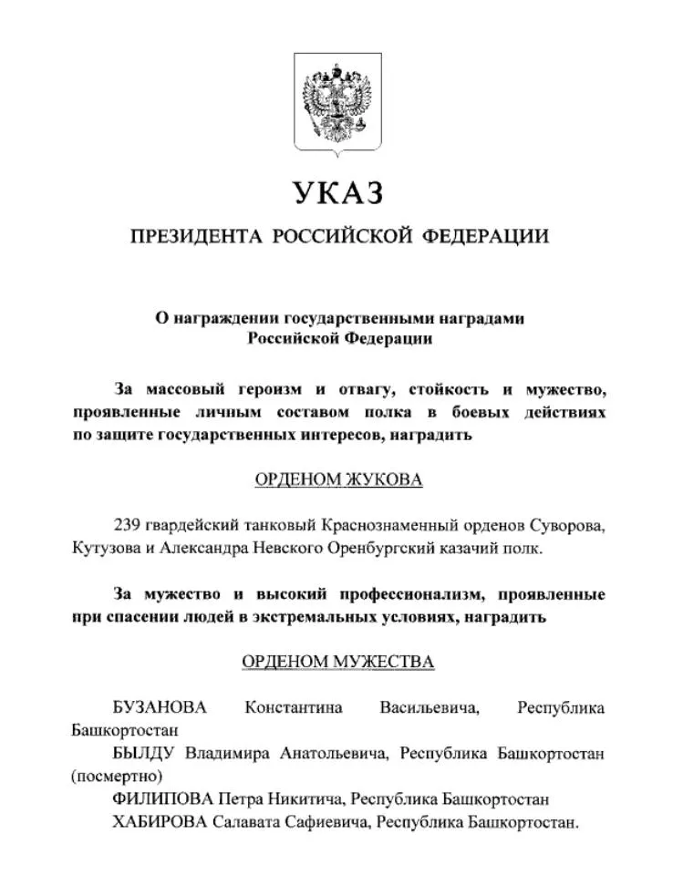 Краснознамённого, орденов Суворова, Кутузова и Александра Невского Оренбургского казачьего полка с высокой государственной наградой – орденом Жукова, а лично Вас – с присвоением звания Героя Российской Федерации.