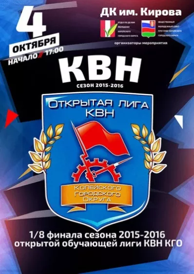 Дорогие друзья, отдел по делам молодёжи и общественный молодёжный Совет при Главе городского округа приглашает Вас отлично провести выходные, посетив 1/8 Финала сезона 2015-2016 гг. Открытой обучающей лиги КВН Копейского городского округа.