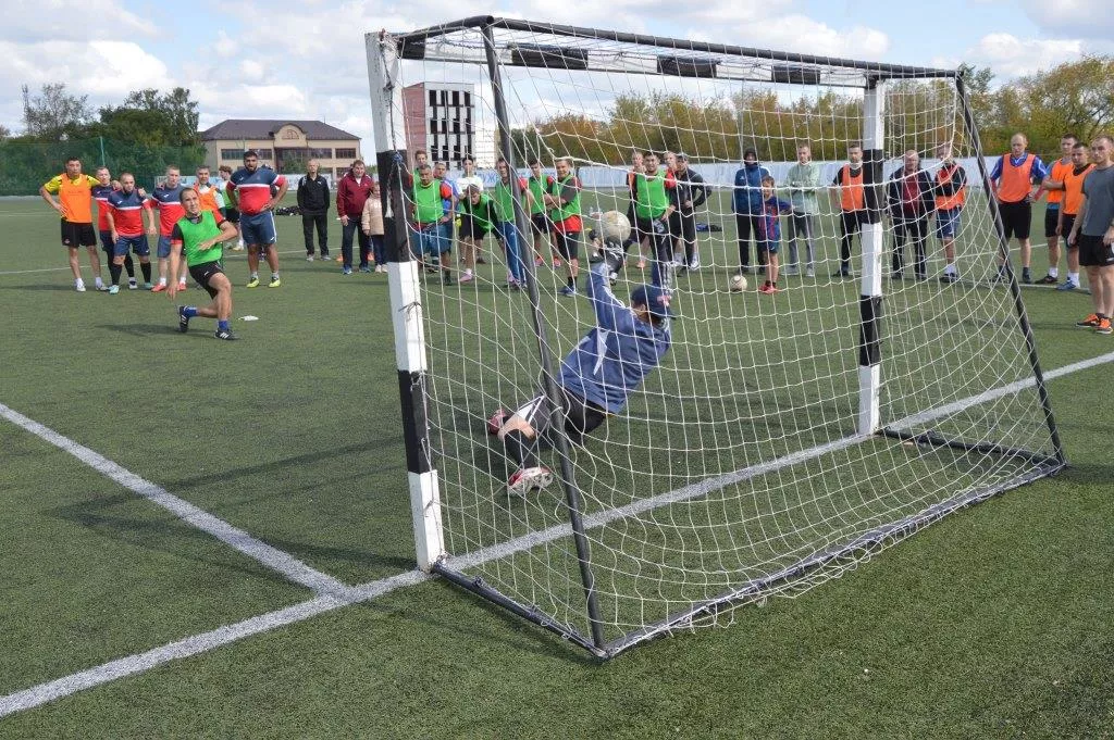 На фото финальный матч. Команда «Пожарка» в оранжевых манишках. Матчи были напряжёнными и интересными, болельщики активно поддерживали свои любимые команды.