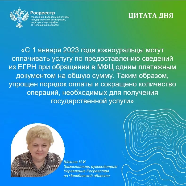 «С 1 января 2023 года южноуральцы могут оплачивать услугу по предоставлению сведений из ЕГРН при обращении в МФЦ одним платежным документом на общую сумму, – комментирует заместитель руководителя Управления Росреестра по Челябинской области Наталья Шакина. – Таким образом, упрощен порядок оплаты и сокращено количество операций, необходимых для получения госуслуги».
