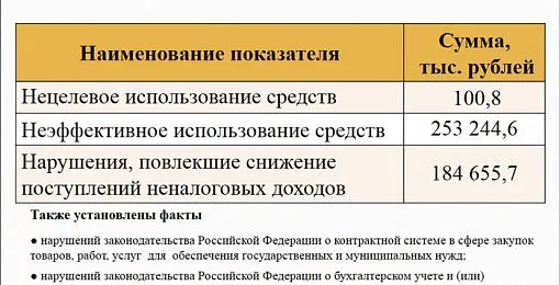 Если говорить о нецелевом использовании денег, то здесь нарушений сравнительно немного. Аудиторы выявили фактов нецелевого использования на общую сумму 100,8 тыс. рублей. Зато бросается в глаза сумма, которая, по мнению проверяющих, истрачена неэффективно — когда деньги были потрачены, но поставленные цели не достигнуты. По результатам проверки неэффективные траты бюджета КГО составили 253,2 млн. рублей.
