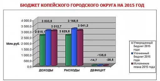 Бюджет Копейского городского округа по расходам на 2015 года утвержден в сумме 2 629,8 млн. рублей, годовой план увеличен на 12 процентов, или плюсом 538,7 млн. рублей, и составил 3 168,5 млн. рублей.