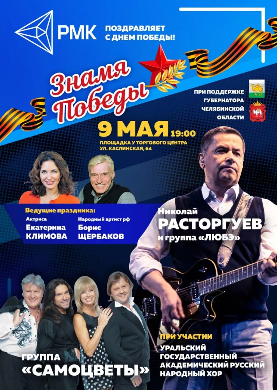 При поддержке губернатора Алексея Текслера Русская медная компания организует концерт “Знамя Победы”. При содействии РМК каждый год организовываются культмероприятия в честь праздника Победы. Культурная программа состоится при участии знаменитых артистов России в Челябинске 9 мая.