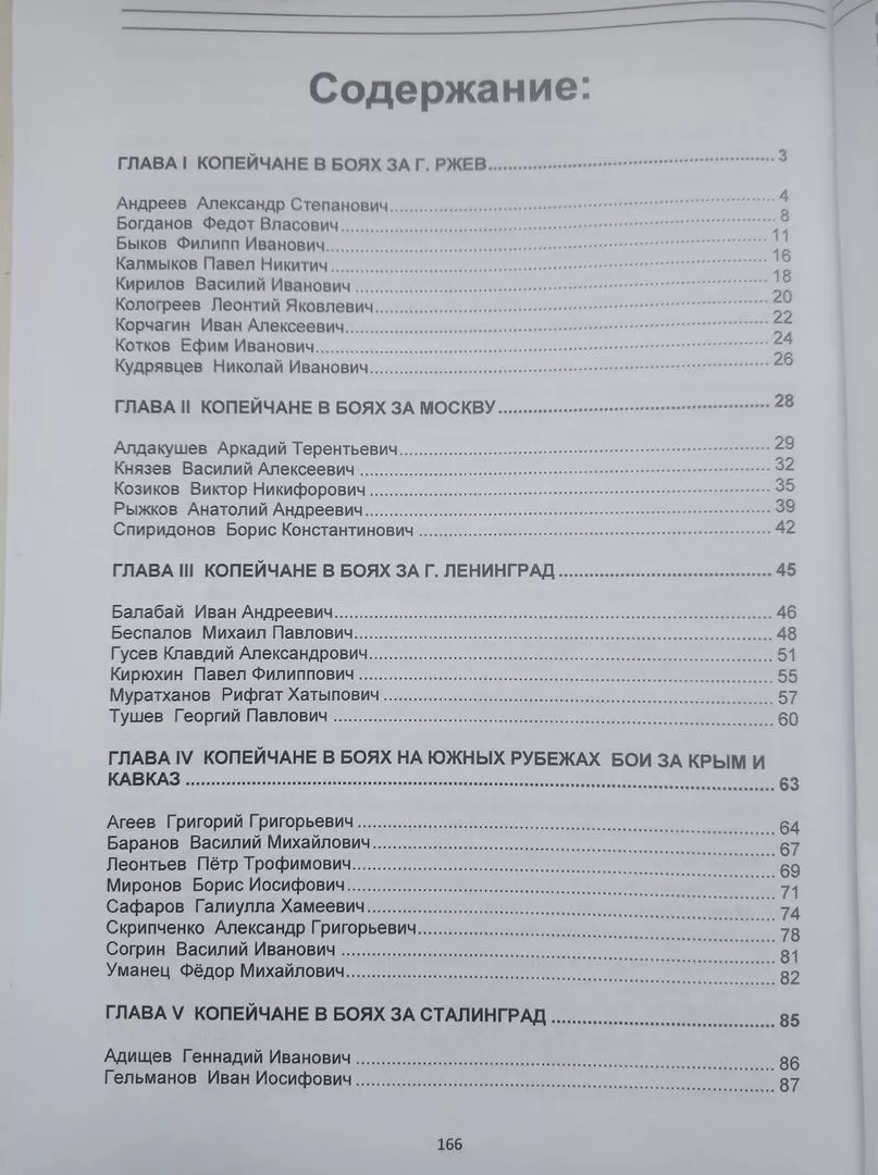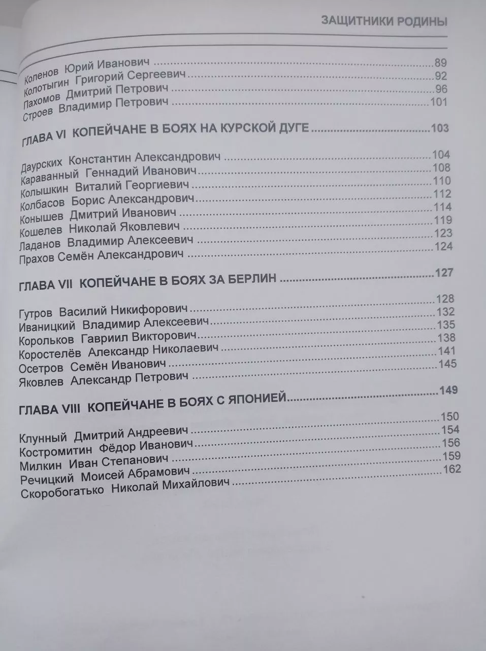 Книга разбита на тематические части: в них рассказывается о наших земляках, участвовавших в боях за Ржев, Москву, Ленинград, Крым и Кавказ, Сталинград, в боях на Курской дуге, в боях за Берлин, отдельная часть посвящена участию копейчан в боях с Японией.