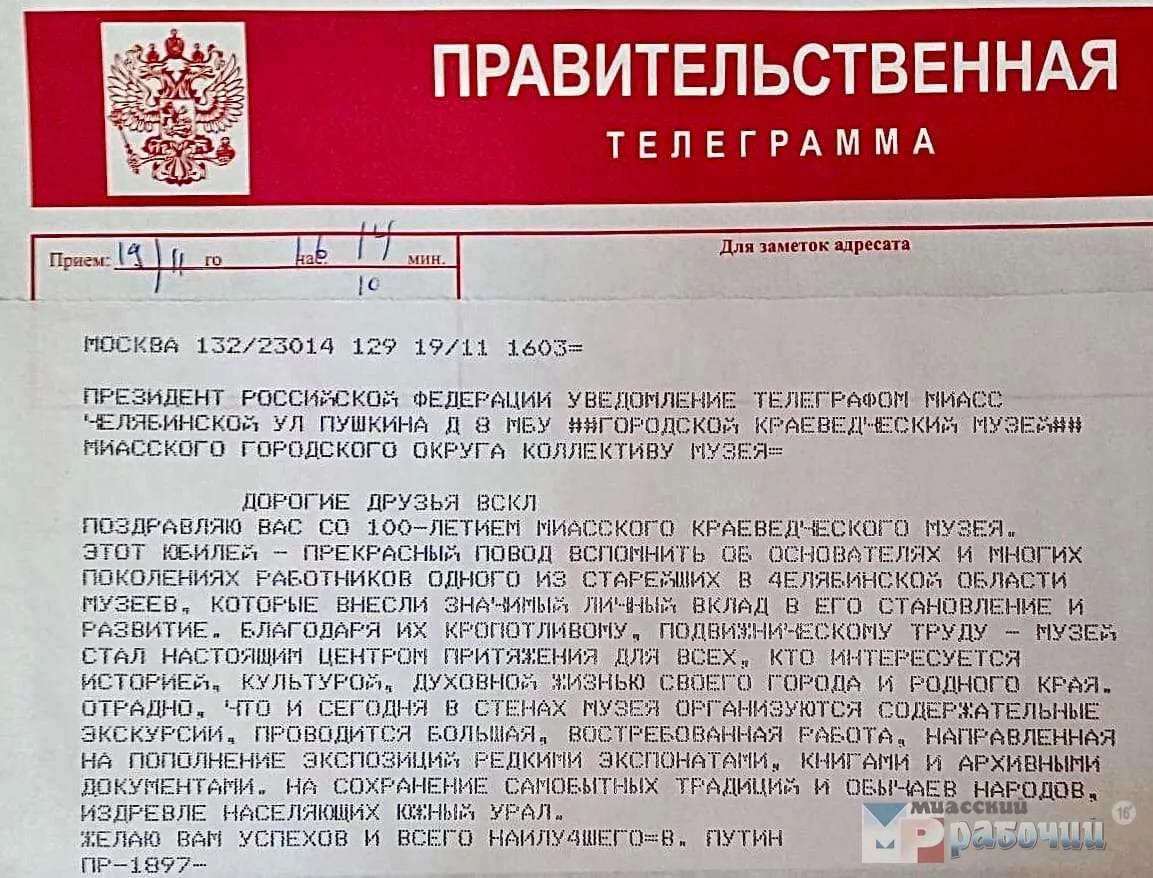 В праздничный день в адрес коллектива музея пришла правительственная телеграмма за подписью Президента Владимира Путина.