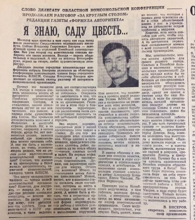 В 1987 году состоялась XXV областная комсомольская конференция, делегатом которой был избран Владимир Бисеров, комсорг санэпидемстанции. Его взгляды о роли комсомола в обществе были изложены в одном из номеров «Копейского рабочего».