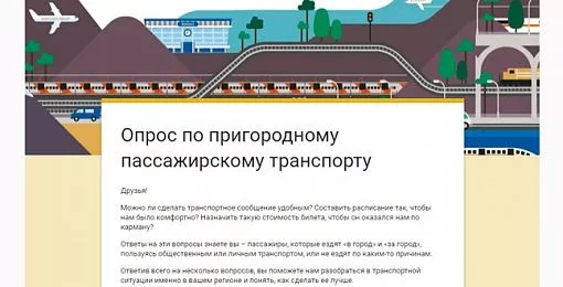 Интернет-опрос проводит Аналитический центр при Правительстве РФ по запросу Министерства транспорта РФ. Инициатива была создана, чтобы узнать потребности жителей регионов и на основании их мнений, предложений, заявлений сделать транспортное сообщение более удобным, изменить должным образом расписание, повысить качество обслуживания и назначить адекватную стоимость билета.