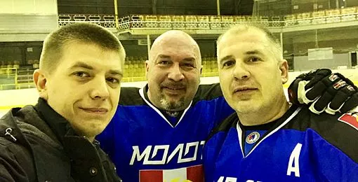 На фото слева направо: руководитель хоккейной команды «Молот» Николай Балмашнов, защитник Кирилл Крылов и нападающий Андрей Махов