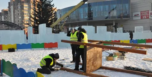 Тем временем полным ходом идет сооружение новогоднего ледового городка. Елочка-красавица установлена еще в пятницу и теперь ждет только, когда ее украсят. Вокруг одна за другой вырастают ледовые фигуры.