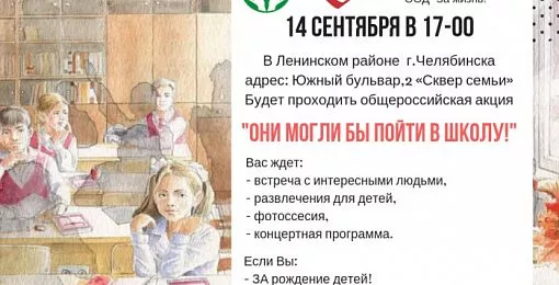 Сегодня, 14 сентября, в 17:00 в Ленинском районе Челябинска пройдет всероссийская акция «Они могли бы пойти в школу». Помимо столицы Южного Урала в социальном проекте, направленном на профилактику абортов, участвуют тридцать три региона страны.