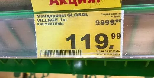 Жительница города выложила в соцсети фото ценника с опечаткой. В день распродаж мандарины, на ценнике которых была указана сумма 9 999 рублей, продавались всего по 119 рублей за килограмм!