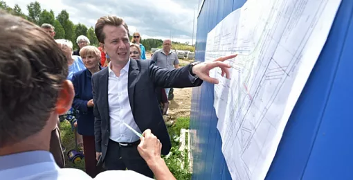 Комментарий дает депутат Госдумы Владимир Бурматов после оценки хода строительства и общения с жителями: