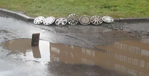 Однако не прошло и полгода, как асфальт вновь провалился, и одной из многочисленных жертв коварной дороги вновь стал наш читатель Геннадий Александрович. Яму с острыми асфальтовыми краями наполнила дождевая вода, и угадать под лужей опасный провал не представлялось никакой возможности. Геннадий Долбилов пробил два колеса и, остановившись, решил провести небольшое расследование. В небольшом радиусе валялись семь колпаков от колес, которые, по всей видимости, отлетели у машин во время преодоления этой преграды. Позже один знакомый Геннадия Александровича рассказал, что и он в этом месте пробил колесо.