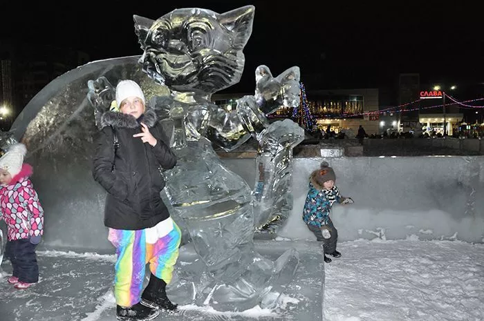 Надо сказать, городок в главной площади города в этом году удался. Посетители праздника особенно отметили мастерство, с каким были вырезаны ледовые фигуры. Кроме Деда Мороза и Снегурочки в ледовом городке детей и взрослых ждали кот Матроскин, Вовка из тридевятого царства и Царевна, заяц и волк из «Ну, погоди!», фрекен Бок и Карлсон, а также другие персонажи советских мультфильмов.
