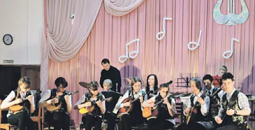 Илья: - Начнем с того, что в нашей школе есть оркестр и ансамбль с названием «Гармония». Те ребята, что играют в ансамбле, играют и в оркестре, это, так сказать, малый состав оркестра. Что касается инструментов, то основа коллектива - это балалайки (прима, секунда, контрабас) и домры (прима, альт, бас). Также используем баяны и различные ударные и шумовые инструменты, с помощью которых мы богато оформляем нашу игру. В этом году в одной из пьес использовали рояль. «Изюминкой» нашего коллектива можно считать гусли.