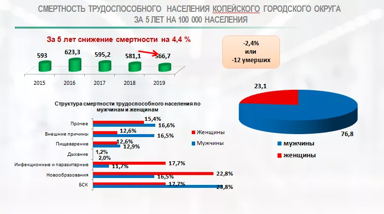 «Если посмотреть на структуру смертности населения Копейского городского округа, то выделяются три основных причины — это болезни системы кровообращения, онкологические заболевания и внешние причины смерти (самоубийства, утопления, ДТП, убийства и так далее), – рассказала Светлана Владимировна. – У нас в 2019 году по всем этим трем показателям идет рост. Если посмотреть структуру смертности трудоспособного населения, то основные причины смерти — те же самые, но новообразования — на третьем месте, а внешние причины — на втором.