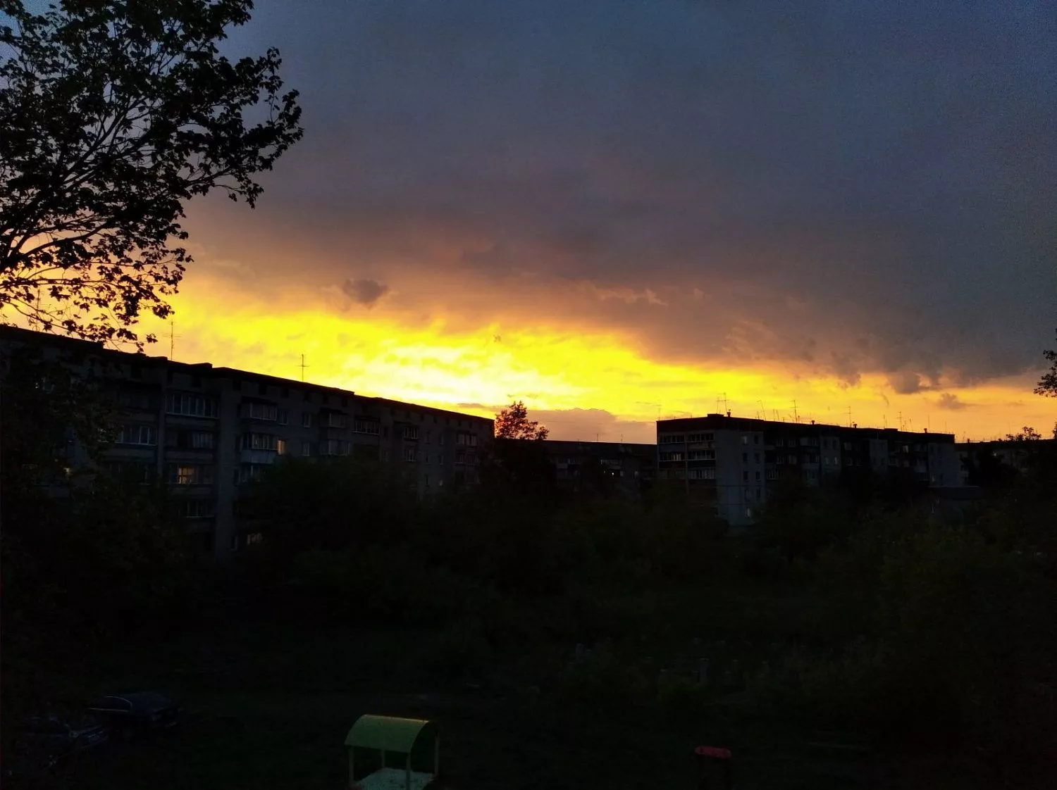 Днем солнца почти не было, небо закрывала облачность. Зато к вечеру закатное солнце залило весь горизонт насыщенным желто-золотым сиянием, подкрасив облака изнутри. Над темными тучами оно смотрелось просто волшебно.