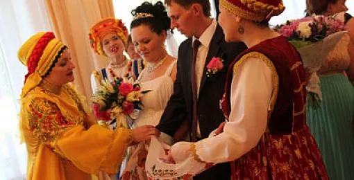 В отделении ЗАГС пары встречал ансамбль Дворца культуры имени Ильича «Русская душа» с песнями и хороводами. Каждый «ясный сокол» и «белая лебедушка» проходили специальный обряд: руки жениха и невесты связывают между собой, чтобы жизнь была их счастливая, и шли они всегда рука об руку в мире и согласии. Но на этом сюрпризы не заканчивались. На церемонии регистрации брака молодожены получали поздравления и подарки не только от родителей и гостей, но и от главы города: каждой паре вручали по букету ромашек. Ведь именно этот цветок стал символом семьи, любви и верности.