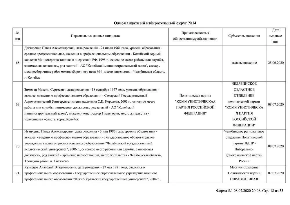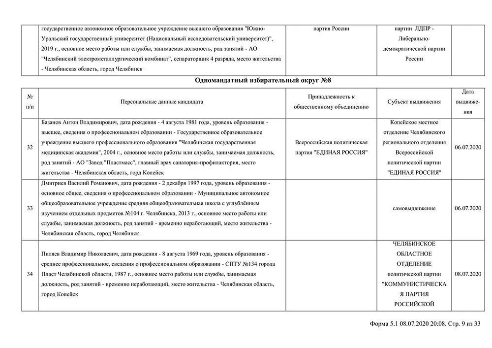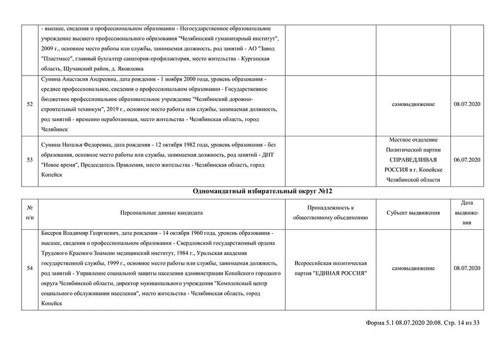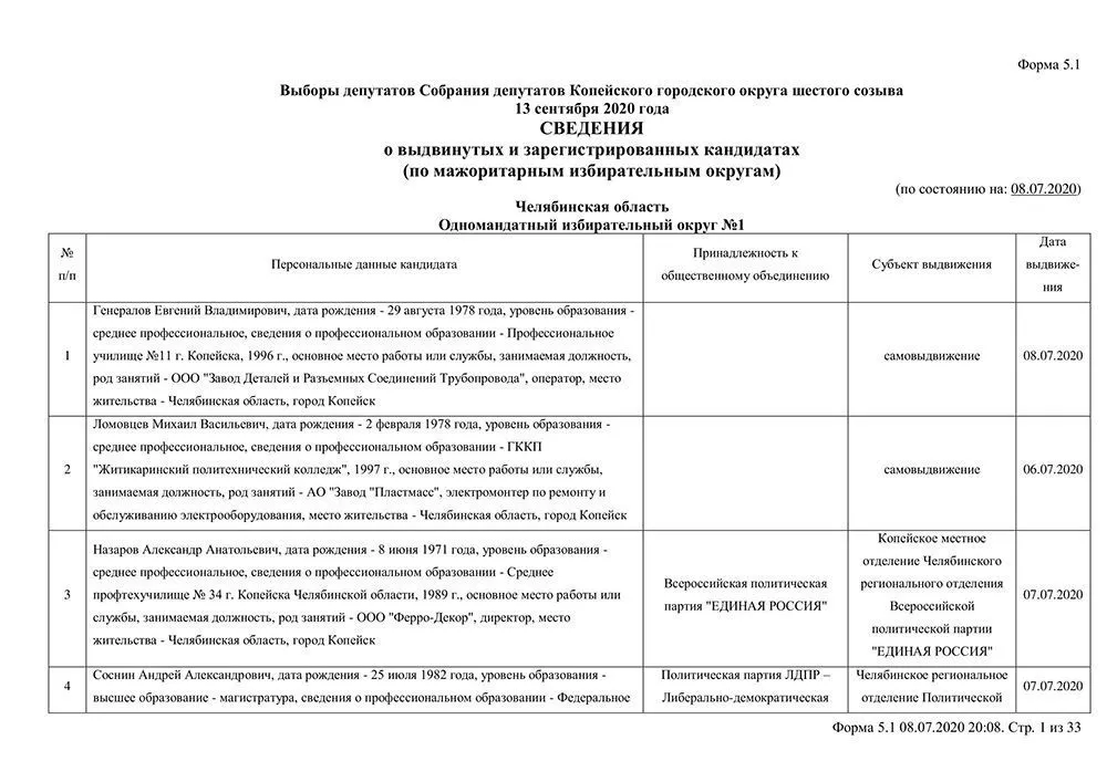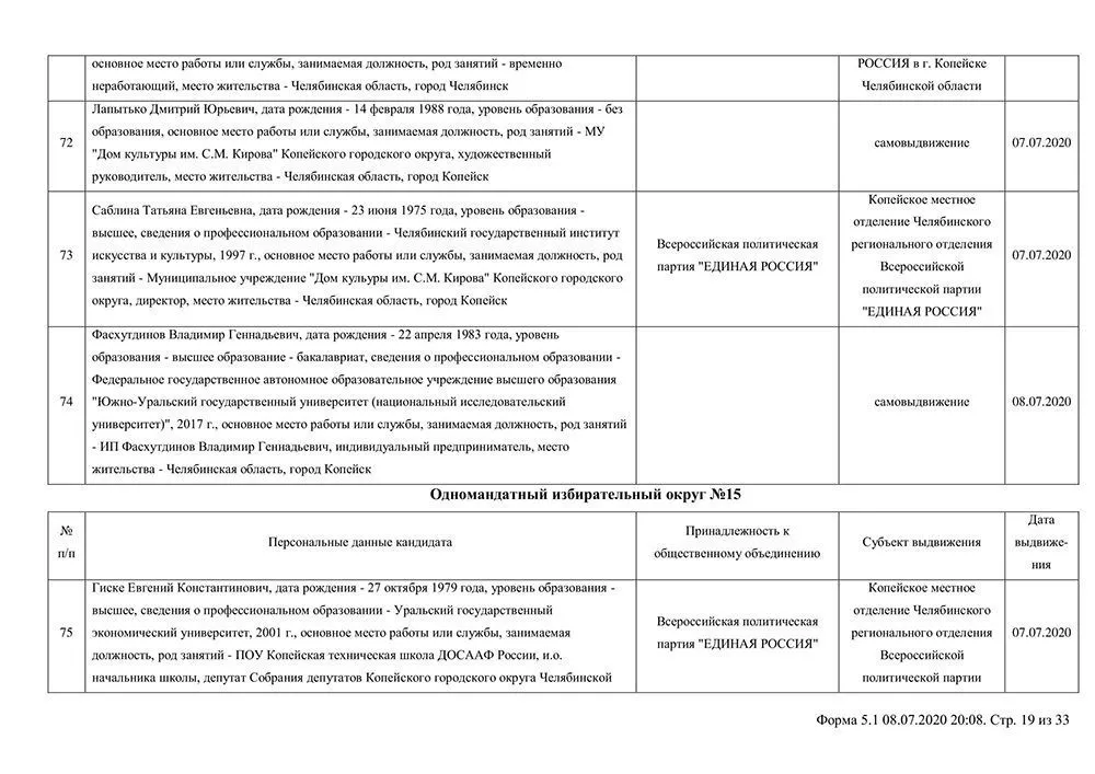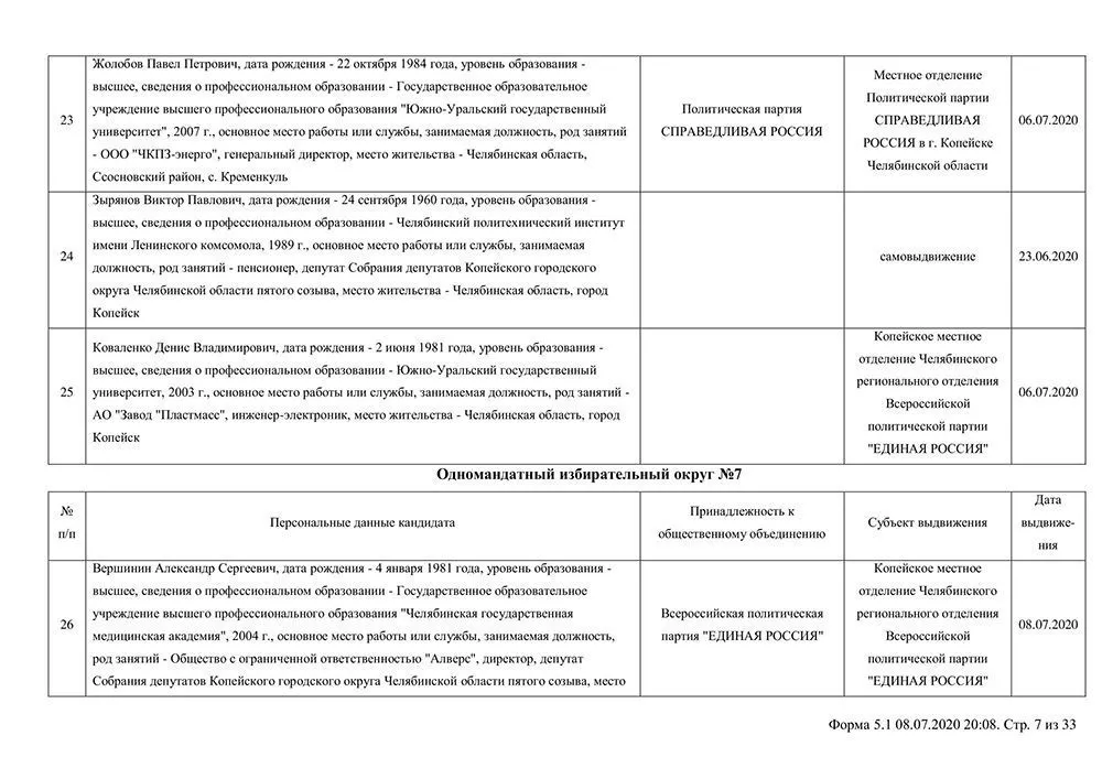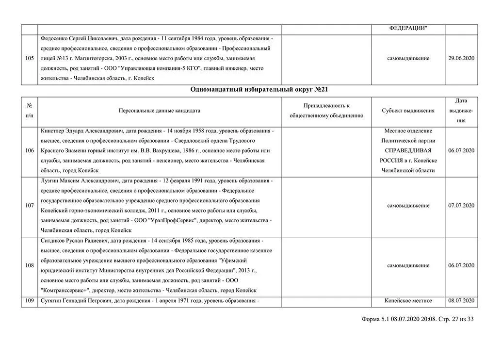Сведения о выдвинувшихся кандидатах в депутаты Собрания депутатов Копейского городского округа.