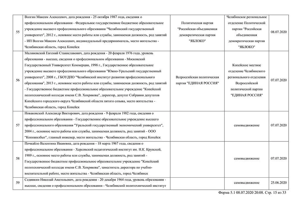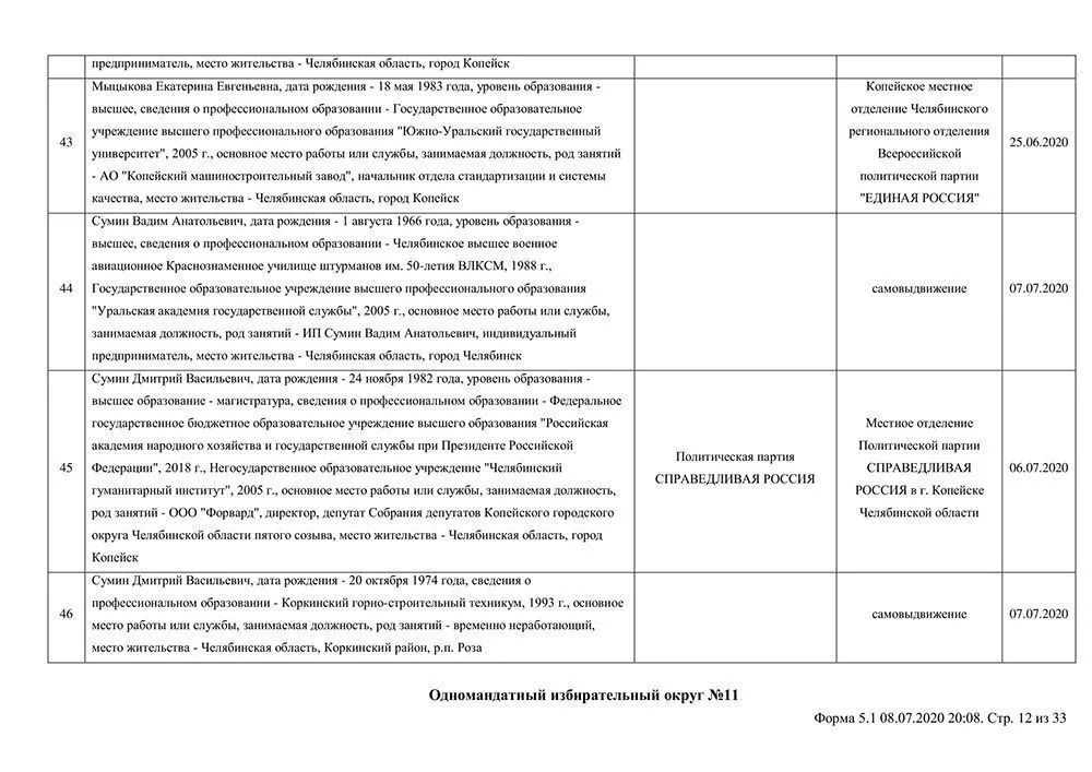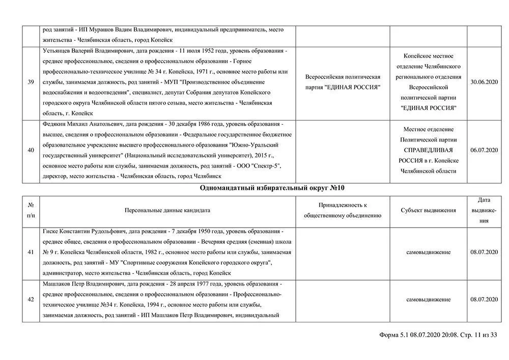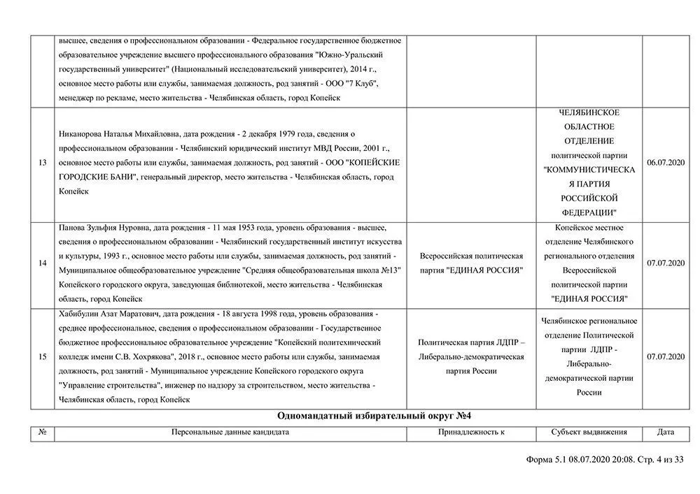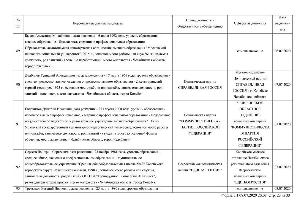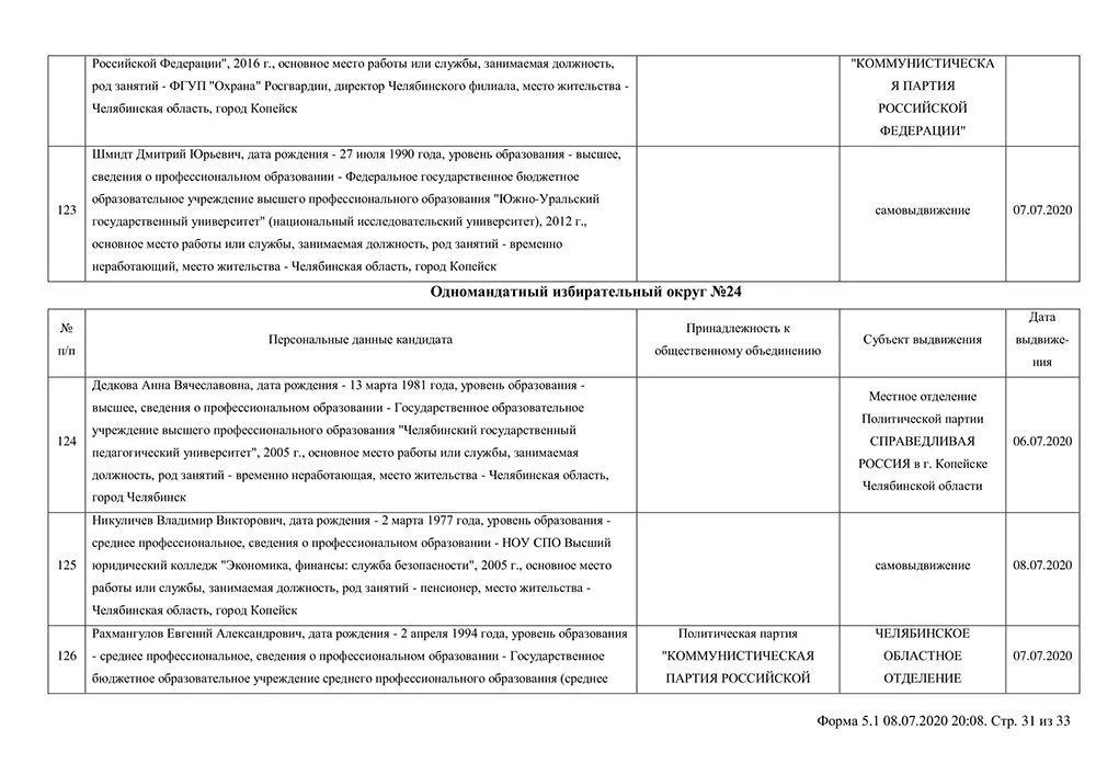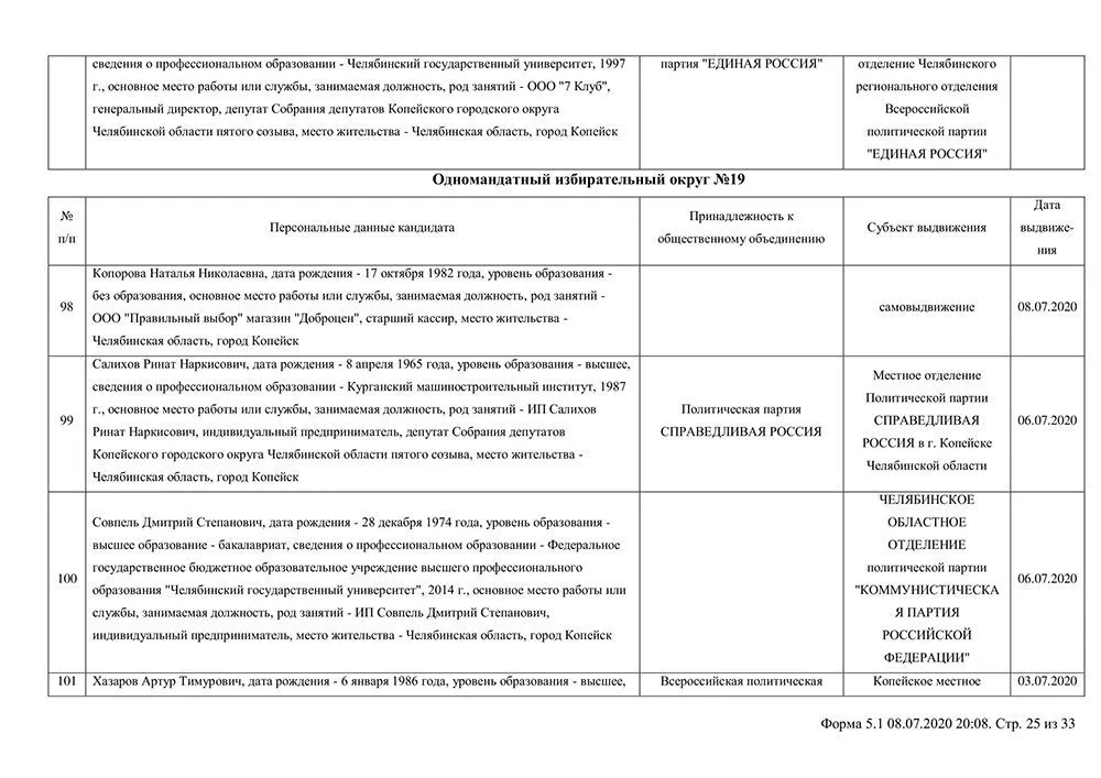 Сведения о выдвинувшихся кандидатах в депутаты Собрания депутатов Копейского городского округа.