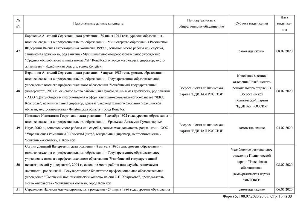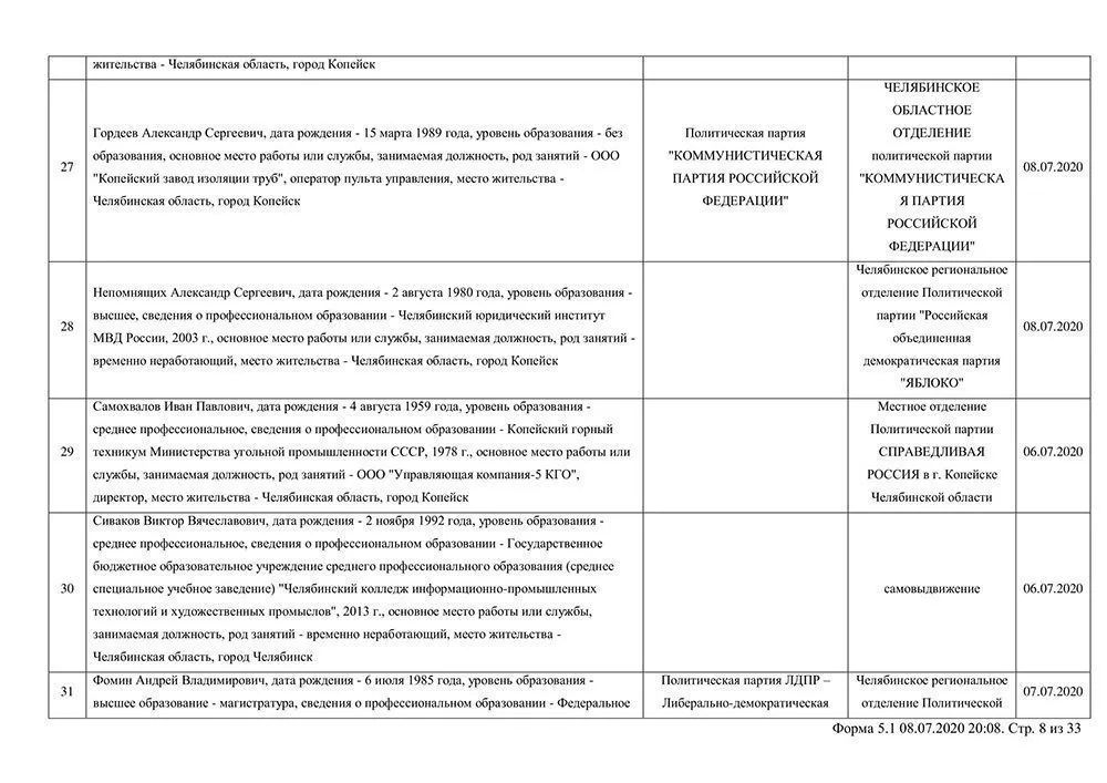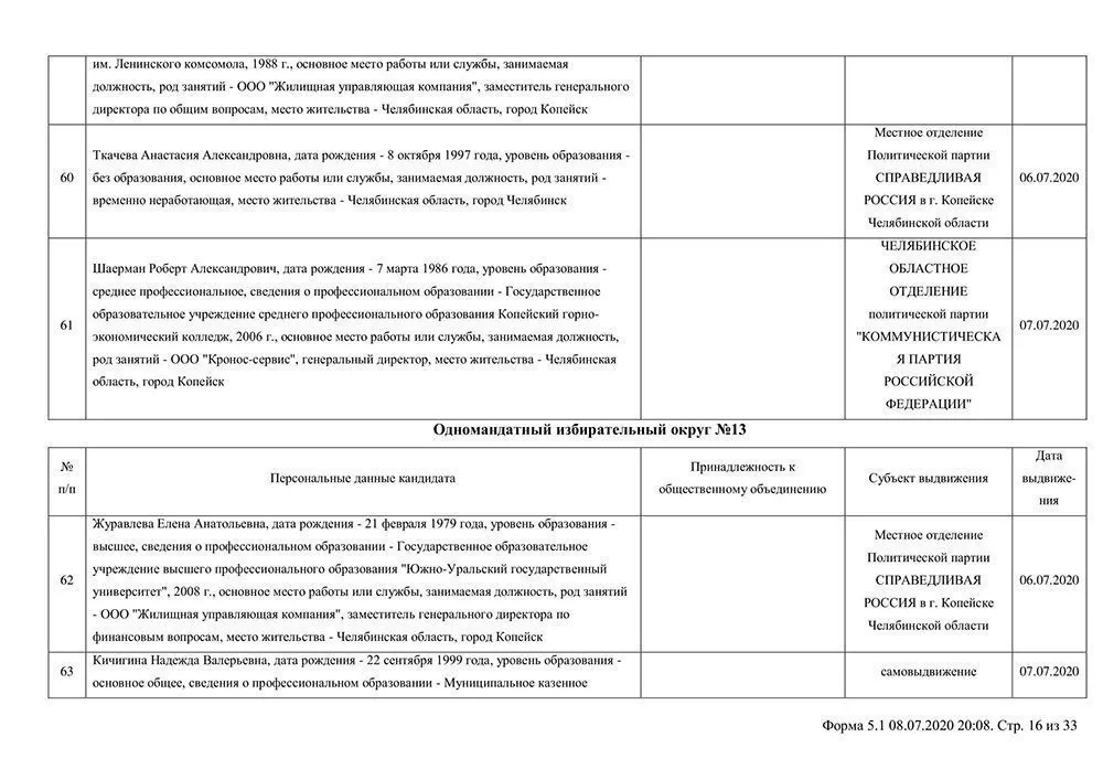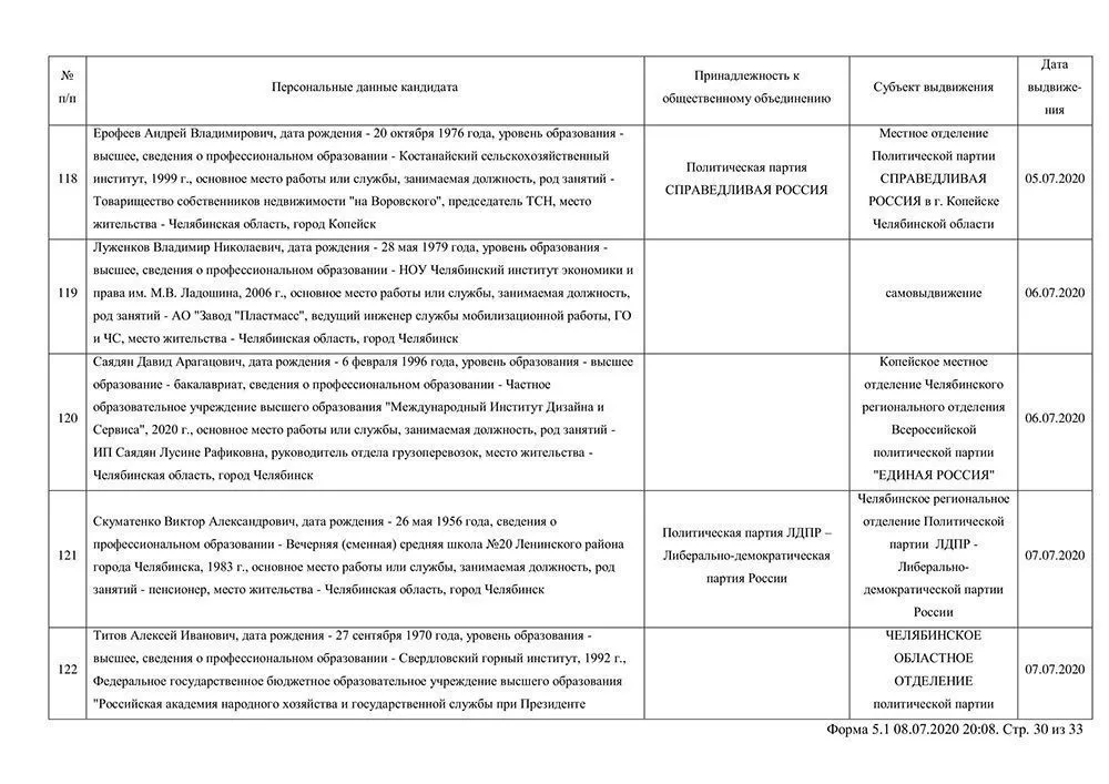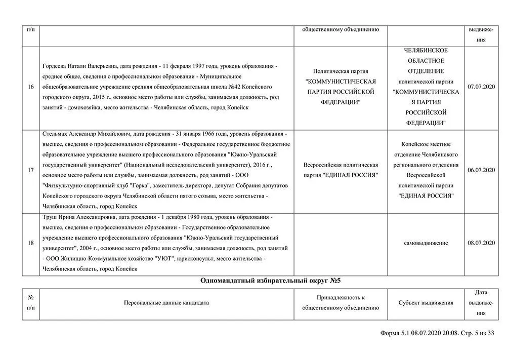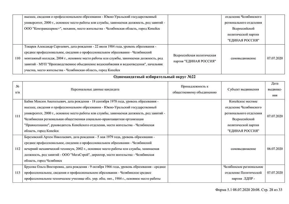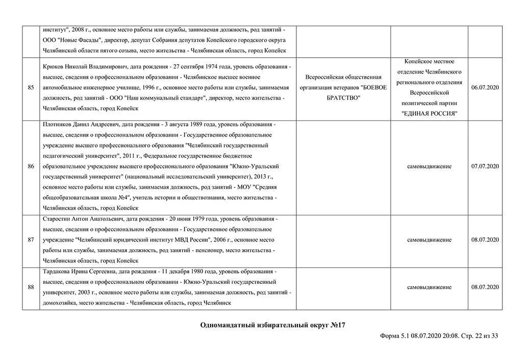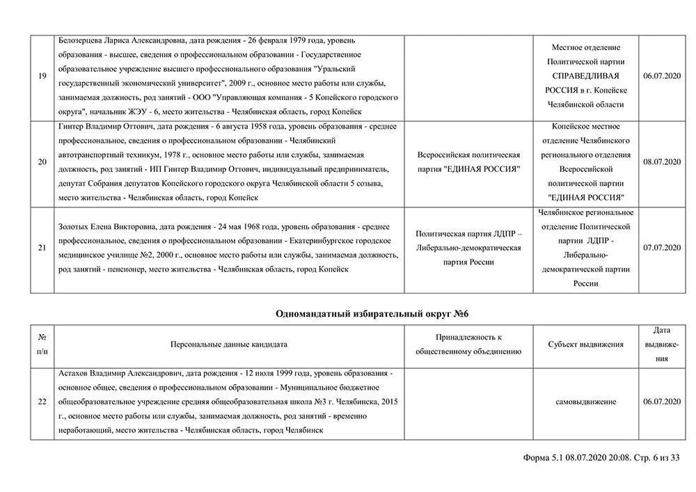 Сведения о выдвинувшихся кандидатах в депутаты Собрания депутатов Копейского городского округа.