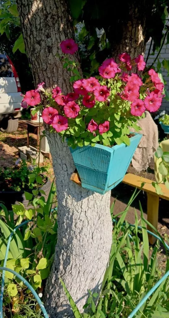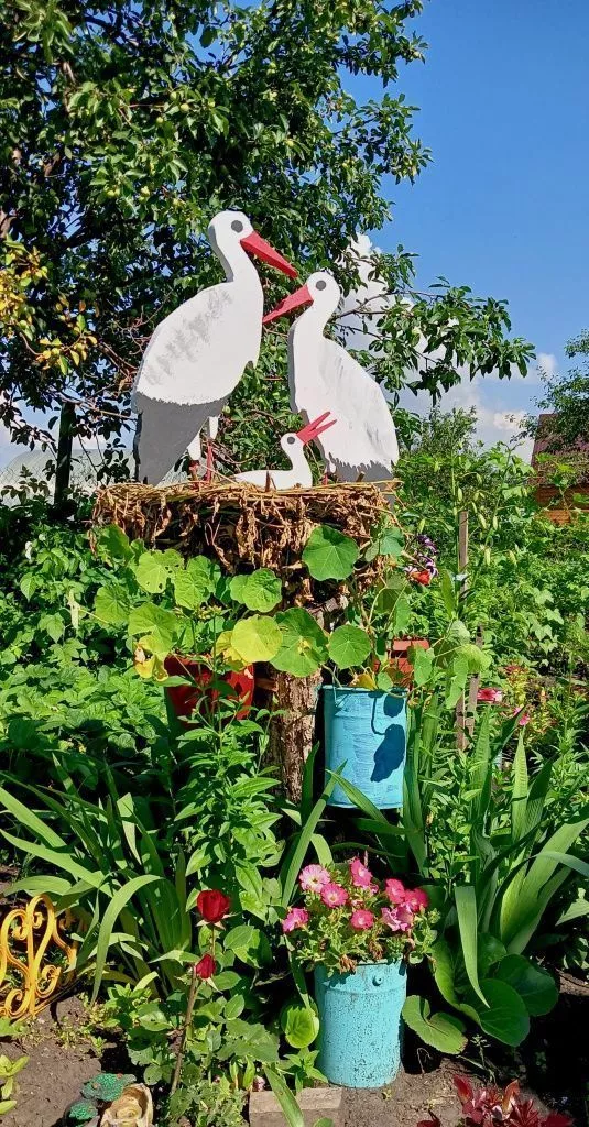 Но это ещё не всё. В центре цветочника недавно спилили старую яблоню. Пень оставили высотой более метра. Вначале на нём разместили вазоны с цветами, а после недавней публикации на страницах «Копейского рабочего» рассказа об умельце из Старокамышинска, который мастерит аистов и лебедей из фанеры, решили тоже попробовать. Классно получилось, согласитесь! Птиц, оказывается, тоже вырезали из утеплителя из твёрдой пены.