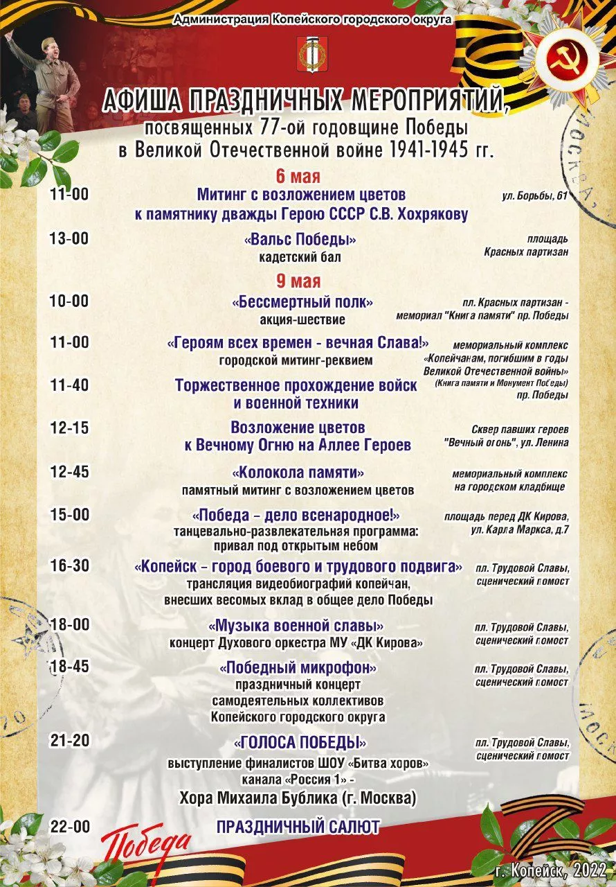 В 10:00 в Копейске стартует шествие Бессмертного полка, затем в 11:00 начнется парад с участием военной техники. После него состоится концертная программа.