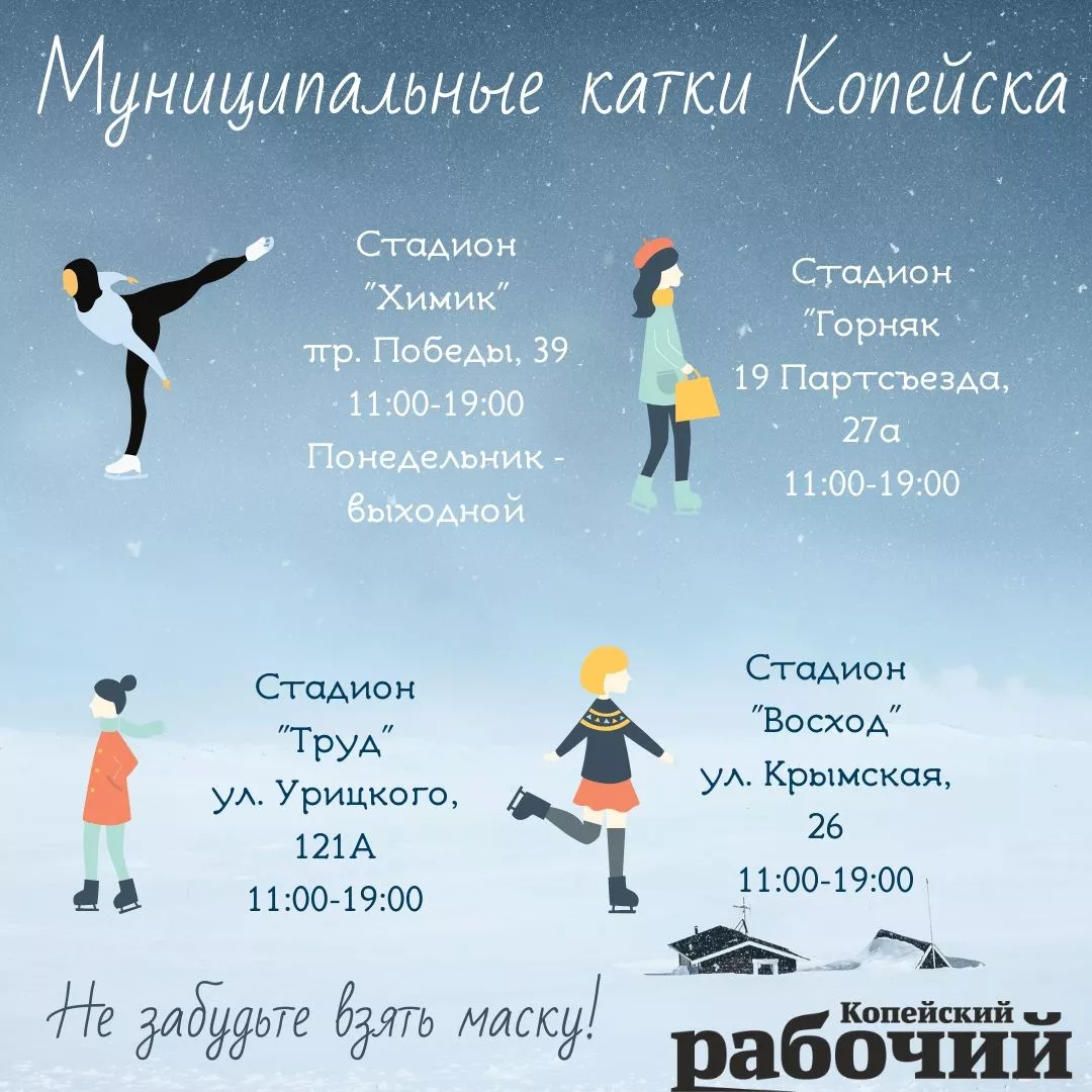 В Копейске в нынешнем сезоне будут работать традиционные катки: на стадионе Химик, в поселке Горняк, в поселке Бажово и в Старокамышинске. Проката коньков в Старокамышинске нет.
