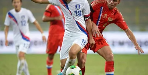 Южнокорейцы активно начали матч. Они больше владели мячом, неплохо комбинировали в центральной зоне. Прострелы в штрафную российской команды блокировали наши защитники. Основную угрозу для ворот Игоря Акинфеева представляли дальние удары. В первом тайме с ними удачно справился голкипер «армейцев». Россияне в первом тайме присматривались к сопернику, изучали его манеру игры. Единственный шанс открыть счет имел Василий Березуцкий. Капитан сборной выиграл борьбу в воздухе на ближней штанге, пробил, но мяч в считанных сантиметрах разминулся со стойкой.
