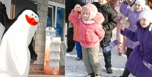 Пингвин радостно принимал подарки и приготовил для юных друзей великолепное угощение – 5-килограммовый торт, украшенный эмблемой «Горки».