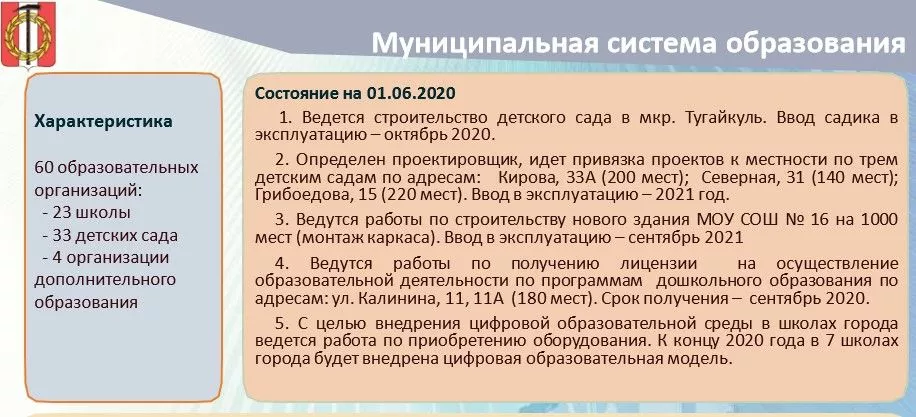 Речь идет в первую очередь о новых объектах: школа на 1000 мест и детский сад в микрорайоне Тугайкуль.