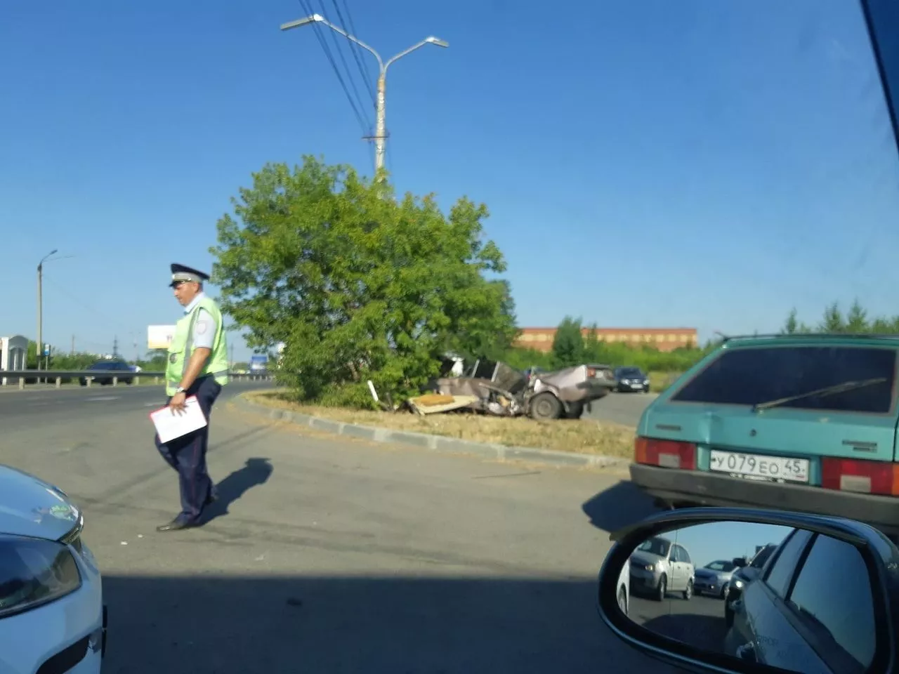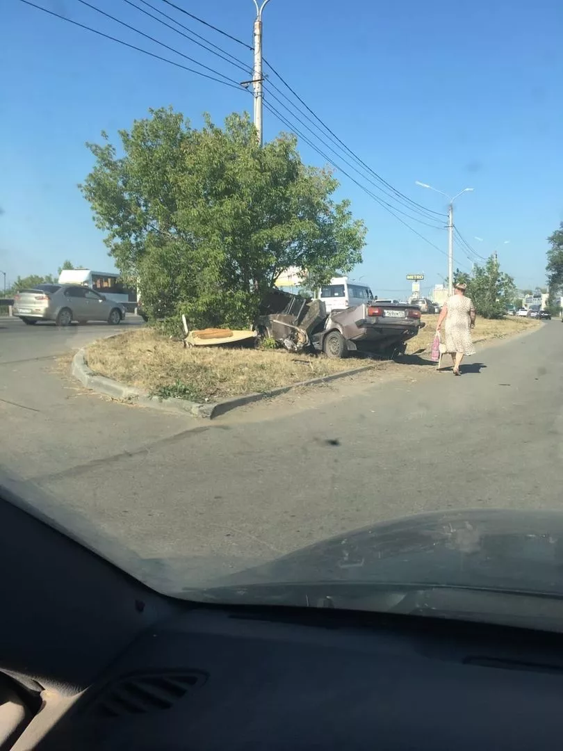 На снимках, сделанных из окна проезжающих мимо машин, видно, что на газоне стоит искореженный автомобиль марки ВАЗ.
