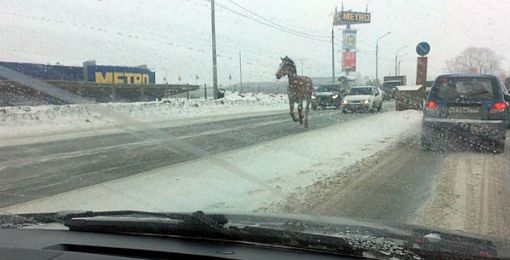 Если бы видеорегистраторы могли удивляться, они были бы удивлены, как и их владельцы, которые могли наблюдать лошадь, которая резво двигалась по трассе вдоль торгового комплекса Метро от Копейска в сторону Челябинска!