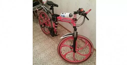 Велосипед «LR» красного цвета на 2-х подвесах складной, с двумя колесами на литых дисках красного цвета. На руле черного цвета установлен компас круглой формы оранжевого цвета. На раме с правой и левой сторон имеется надпись черного цвета в белой окантовке «LAND ROVER». Также на раме имеется сумочка болоньевая темного цвета, с застежкой «липучка». На раме сверху крепились пластиковая банка для питья черного цвета, фонарик пластиковый черного цвета. К сиденью крепилось детское кресло серого цвета с подстилкой голубого цвета.