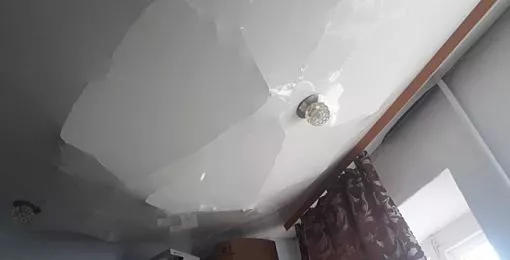 Проживающую в этой квартире женщину от смерти спас натяжной потолок. Он выдержал всю тяжесть, которая могла свалиться на диван женщины.