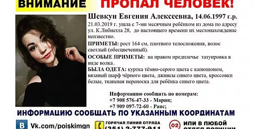 22-летняя Евгения Шевкун ушла из своего дома в Магнитогорске с семимесячным ребенком еще 21 марта. До сих пор ее местонахождение неизвестно.