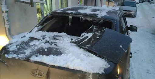 «Тот же дом... Проспект Ленина 61. Где 6 сентября 2015 года рухнул балкон. Сегодня на мою машину упала огромная ГЛЫБА ЛЬДА!!! Части льда видно как возле автомобиля, так и внутри... А на крыше дома со всех сторон здоровенные сосульки!!! Пострадало несколько автомобилей.